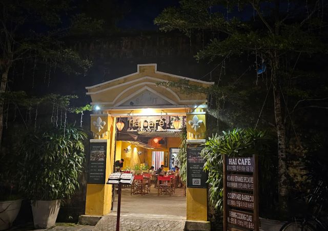 Hai Café BBQ Courtyard nằm ngay trung tâm phố cổ, có hai cửa vào tại 98 Nguyễn Thái Học và 111 Trần Phú, TP. Hội An. Quán kết hợp nhà hàng và khu nướng than ngoài trời, với không gian sân vườn rộng thoáng. Thực khách có thể tự chọn thịt, cá, gà nướng tại bàn hoặc gọi set BBQ đặc biệt. Gà nướng ở đây được ướp đậm đà, ăn kèm rau sống tươi và nước chấm phong phú. Quán mở cửa từ 07:00 đến 23:00 hàng ngày.